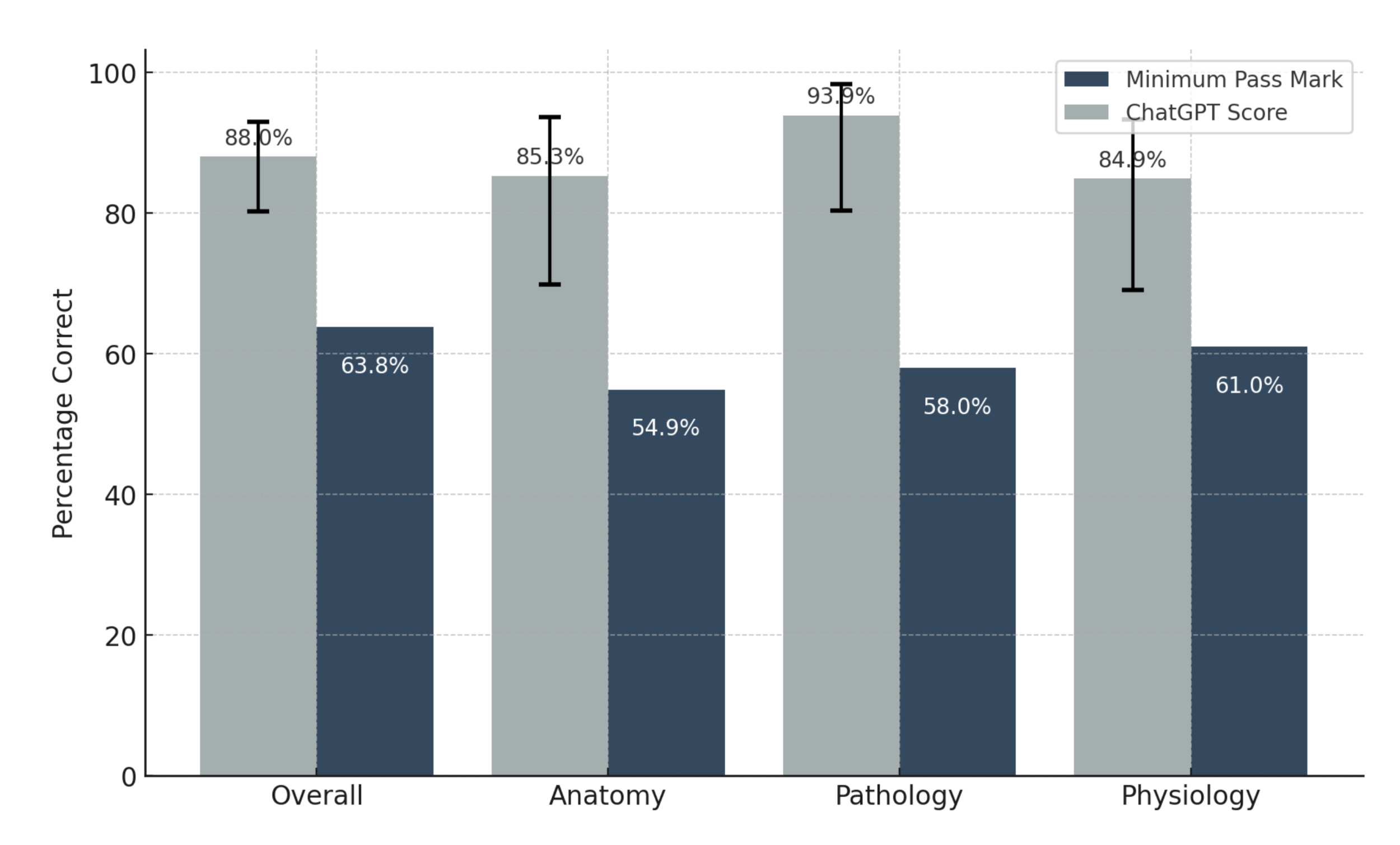 In our study, ChatGPT performed significantly higher than the required pass mark for the multiple-choice questions on the GSSE. These findings exemplify the impressive capabilities of a large language model to recall and apply medical expertise across the topics of anatomy, physiology, and pathology. Literature already exists regarding the benefits demonstrated by using artificial intelligence in medicine and surgery, including diagnostics, risk prognostication, medical and surgical treatments, and patient counselling, among other implementations.8 Our study corroborates these documented benefits.