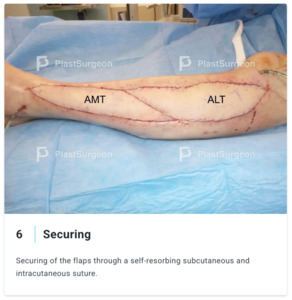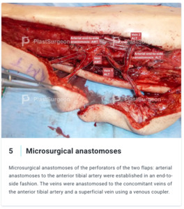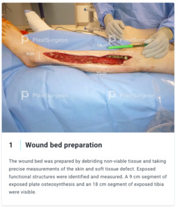 Cases with high-scoring images displayed high resolution, pre-operative surgical drawings/illustrations, multiple angles and surgical steps, perioperative markings of anatomical structures and diagnostic imaging. Referring to the SCARE guidelines point 19, it states that images and/or videos must be included where relevant and include pre-, peri- and post intervention. The guidelines further state adequate annotation on images.10 To some extent the SCARE point captures the relevance of visual aids to mediate understanding. We believe that the plastic surgical assessment conducted in this study calls for more in-depth visual case reporting due to the nature of this specialty. Preoperative markings are crucial for in-patient preparation, surgical understanding and mediation of considerations to peers11,12 and it is therefore of essence to include it in plastic surgical case reporting. It is generally observed that cases that lack comprehensive step-by-step visual aid are assessed less successful in mediating the cases. This overlaps with the study’s assessment of reproducibility following the case step-by-step (SCARE point 12c) in which well-described preoperative, perioperative and postoperative considerations, and explanatory images and/or surgical drawings yielded successful assessments. Not surprisingly, the study reports error-free grammar and precise wording were present in high-scoring cases in the category, quality of written texts which has previously been described.13,14 The clinical solution to the case was added to the questionnaire, which corresponds to SCARE point 12b. The study’s qualitative analysis reported well described rationale for choice of surgery, combining two or more techniques/methods to solve complicated surgical challenges (innovative solution) and well described preoperative considerations of surgical alternatives as key drivers for successful case reporting. As each case report in this study was assessed by a panel of 11 or more specialist plastic surgeons, we believe that it is relevant to discuss using two or more existing methods/techniques to solve a challenging clinical problem. It seems highly appreciated by specialists to rely on basic principles when faced with a challenging case by combining such for successful case mediation. In 2024, Grosu-Bularda et al. proposed a problem-solving approach to solve complex tissue defects.15 They describe various reconstructive methods but conclude that complex tissue defects must take various factors into account, including etiology, defect characteristics, restoration of form, function and psychological aspects, patient compliance, the surgeon’s skills, and emerging technology.15 Their study mentions combinations of emerging techniques and technologies; however, it does not mention the principle of combining basic plastic surgical techniques to solve challenging cases. We believe it is a great philosophy to rely on the basics before exploring new and less tried methods. See Figures 1, 2 and 3 for a case example of high-resolution image with drawings, combining surgical techniques to obtain a great and safe reconstructive result of the lower leg.