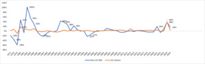 The YOY percent changes in the number of US-citizen match applicants have been stable overall, with only two significant increases, +18 in 1980 and 39% in 2024 (Figure 2).