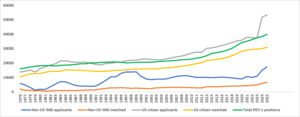 Our analysis has several limitations which should be considered when interpreting the findings. First, our study considers participation in the NRMP as a surrogate for overall US attractiveness for non-US IMGs; however, we could not investigate correlations with their country of origin because country-specific data are not currently reported by the NRMP. As discussed above, there are many country-specific factors which contribute to emigration at a political, economic, and social level. It is therefore impossible to analyze possible correlations with legislative and executive acts targeting immigration from specific countries, or to correlate with many “push” factors. Second, because the 2026 NRMP match results will become available on March 20, 2026, this study does not analyze the impact on IMG match participation of the recent and dramatic changes in political rhetoric and policies since the start of the new administration on January 29, 2025.