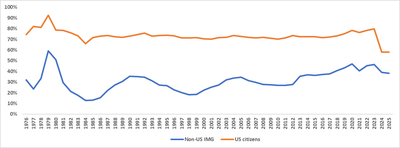 We performed a retrospective cohort analysis of NRMP data generated between 1972 and 2025. Data included the total number of non-US IMGs and US citizens participating in the residency match and their matching rates. We used repeated measures of analysis of variance (ANOVA) to compare differences between time-points of each group. We calculated Chi-Squared test as appropriate to compare categorical data. All statistics were two-tailed, and a p<0.05 was held to represent statistical significance.